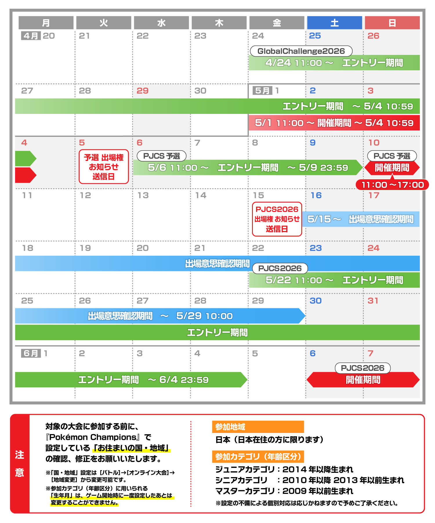 ※ライブ大会「PJCS2026」に出場する際、当日の受付で「グローバルチャレンジ2026」、「PJCS2026予選」のオンライン大会参加時に『Pokémon Champions』で設定されているプレイヤーの国・地域や生年月と、プレイヤー自身の本人確認書類の情報の照合が必要になります。ゲーム内の設定情報と本人確認書類の内容が合致しない場合、その場で参加不可となります。
